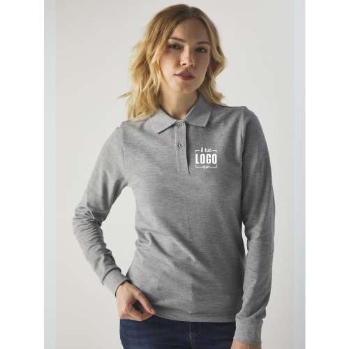 100% cotone piqué. Polo donna a maniche lunghe set-in con costine, 2 bottoni tono su tono, nastro di rinforzo al collo, struttura con cuciture e spacchetti laterali. Etichetta strappabile.Composizione: Grey Heather: 85% cot. 15% visc.