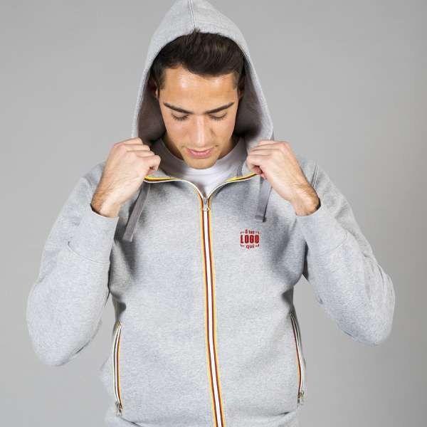 Felpa cotone – polyestere- Cappuccio foderato con cordini- Colletto rialzato- Zip lunga con tessuto giallo/rosso/nero- Due tasche con zip- Nastro di rinforzo interno collo- Polsini e fondo maglia in costina elasticizzata- Cuciture ribattute