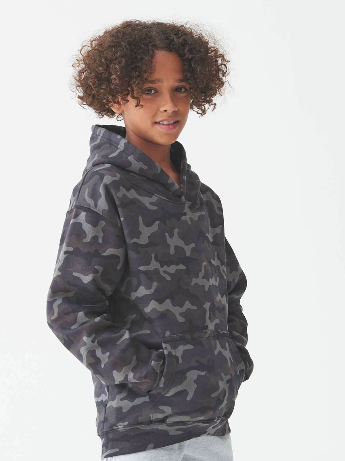 70% cotone ring spun, 30% poliestere. Felpa mimetica con cappuccio doppio, cuciture doppie, tasca a marsupio, cappuccio senza cordini, felpata internamente. Polsini e orlo a costine, cotone morbido sul davanti per una superficie di stampa ideale. Etichetta a strappo perfetta per il rebranding.