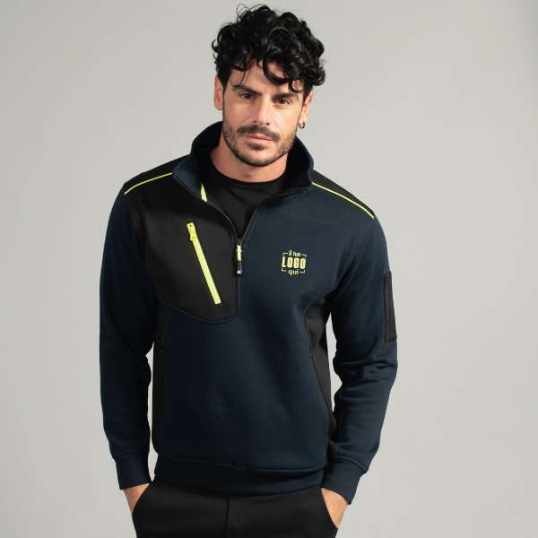 Felpa 60% cotone - 40% polyestere- Spalle, fianchi, avambracci e partesuperiore della schiena in tessutointerlook accoppiato elasticizzato- Collo a lupetto- Nastro di rinforzo interno collo giallo fluoe tessuto appendiabili- Zip corta- Cerniere nastrate YKK- Una tasca con zip giallo fluo sul petto- Due tasche con zip- Triplo portapenna sul braccio- Piping giallo fluo sulle spalle e sulla schiena- Polsini e fondo maglia in costina elasticizzata- Cuciture ribattute- No label