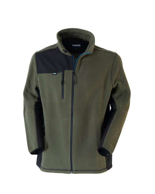 Tessuto effetto tricot. Collo alto per maggiore protezione. Inserti in softshell traspirante ai fianchi e al sottomanica con trattamento antipilling. Fascia parasudore interna al collo. Tasche e taschino al petto con zip. Elastico interno al fondo antiscivolo. Travette di rinforzo.