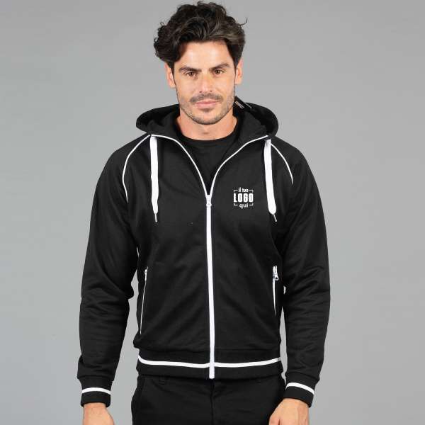Felpa cotone – poliestere tessuto sportive "DRY" con trattamento anti-acqua- Cappuccio foderato con cordini in contrasto- Zip lunga nastrata- Maniche raglan- Due tasche con zip nastrate- Profili in contrasto su cappuccio e spalle- Nastro di rinforzo bicolore nel collo- Polsini e fondo maglia in costina elasticizzata (con riga in contrasto nel Man e nel Boy)