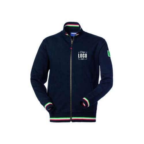 Felpa con chiusura centrale con cerniera in ottone brunito, parasudore interno al collo e ricamo posteriore tricolore sotto il collo. Polsi, collo e fascia girovita in maglia elastica con inserti colorati, due tasche inferiori a filetto e scudetto tricolore applicato sulla manica sinistra.