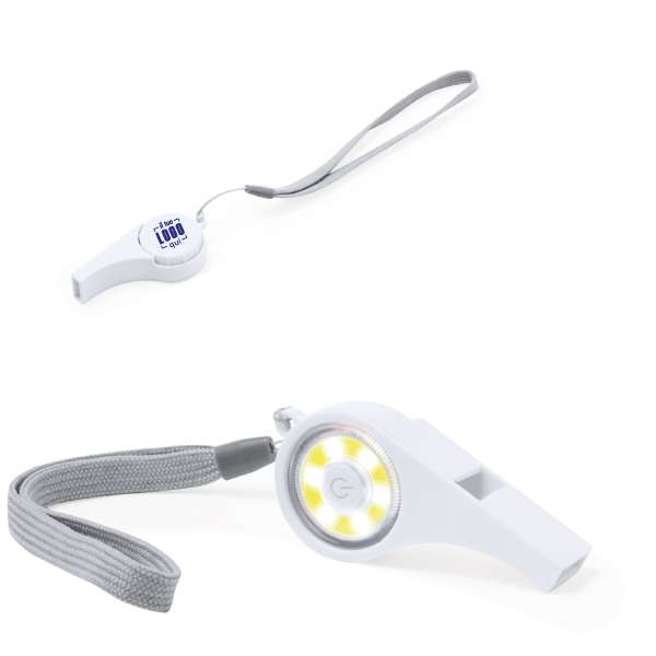 Ingegnoso fischietto multiuso con luce integrata nel corpo. Realizzato in robusto ABS, con 6 luci COB e diverse posizioni di illuminazione: fissa con due livelli di intensità e lampeggiante per una maggiore visibilità. Il cordino consente di trasportarlo comodamente ed è alimentato da una batteria a bottone (inclusa). Presentato in una scatola dal design kraft.