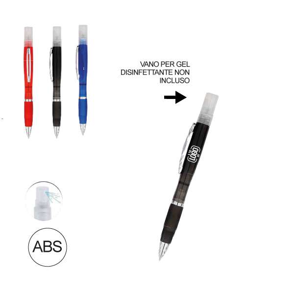 Penna a sfera innovativa con contenitore integrato da 4 ml per gel disinfettante (non incluso). Meccanismo a rotazione, minuterie cromate e grip in gomma colorata per un'impugnatura confortevole. Perfetta come gadget promozionale per fiere, farmacie, eventi sanitari e settori legati all’igiene. Personalizzabile con stampa tampografica o UV.