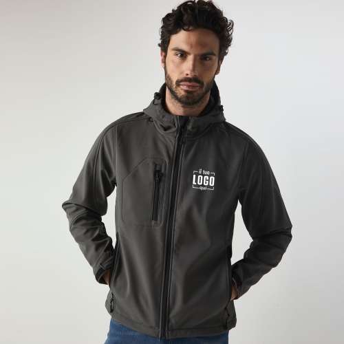 94% poliestere, 6% elastan. Giacca in softshell a 3 strati, cappuccio con fermi in plastica, occhielli e cordino neri. Due tasche laterali con zip, una taschino sul petto con zip, tirazip in plastica, zip interna lato cuore per la personalizzazione, polsini regolabili con velcro, interno in micropile. Bordo inferiore con cordino regolabile con fermi.Impermeabilità 8000 mm, traspirabilità 1000 gr/m2. Etichetta strappabile.