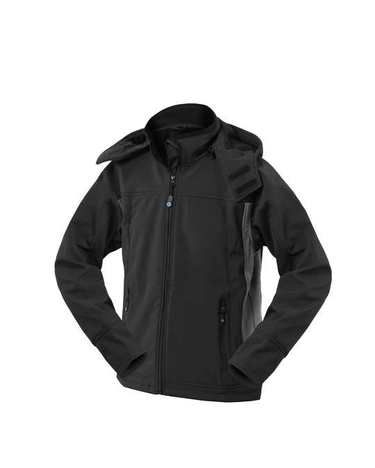 Giubbotto in tessuto Softshell a tre strati, chiusura con zip centrale, cappuccio con coulisse e velcro di chiusura applicato al giubbetto tramite zip. Un taschino interno al petto destro chiuso con zip, inserti di colore a contrasto lungo i fianchi, due tasche inferiori chiuse con zip. Polsi interni in maglia elastica, fondo posteriore arrotondato, coulisse al fondo del capo. 8000 mm WP/2000 MVP.