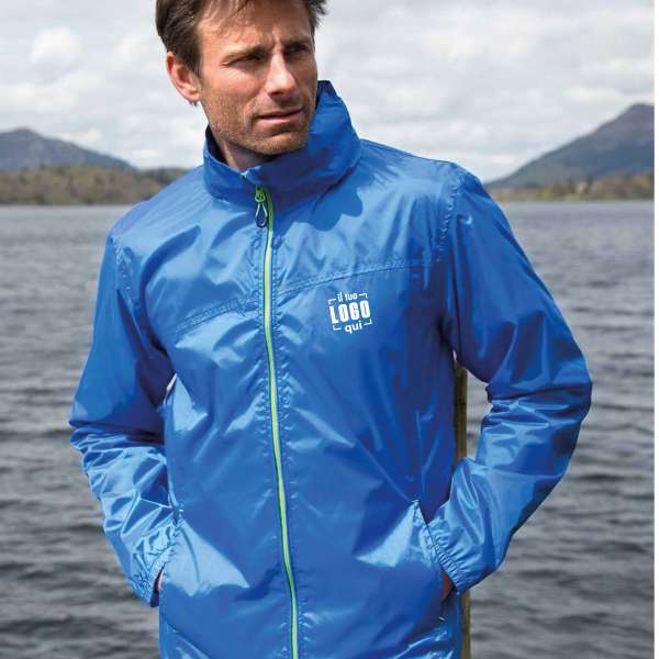 100% nylon. Giacca antivento, traspirante e impermeabile 3000mm. Zip frontale intera di colore contrastante, polsini elasticizzati, cappuccio a scomparsa, 2 tasche laterali di cui una con chiusura a zip. Cuciture nastrate.