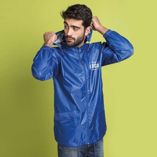 impermeabile antivento; cappuccio a scomparsa; laccio stringivita; tasche laterali; ripiegabile in custodia; polsini elastici; interno a contrasto