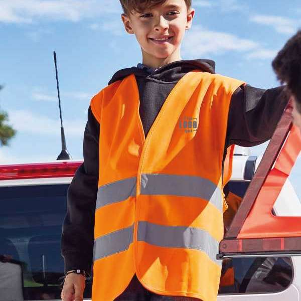 100% poliestere. Gilè di sicurezza per essere stampato, Taglia unica 140-164 per bambini. Materiale catarifrangente con strisce riflettenti. EN ISO 20471 : 2013 classe 2, Chiusura in velcro. Il gilè può essere ripiegato in un sacchetto separato, Tessuto esterno: 100% poliestere, Bambini. Velcro, Safety
