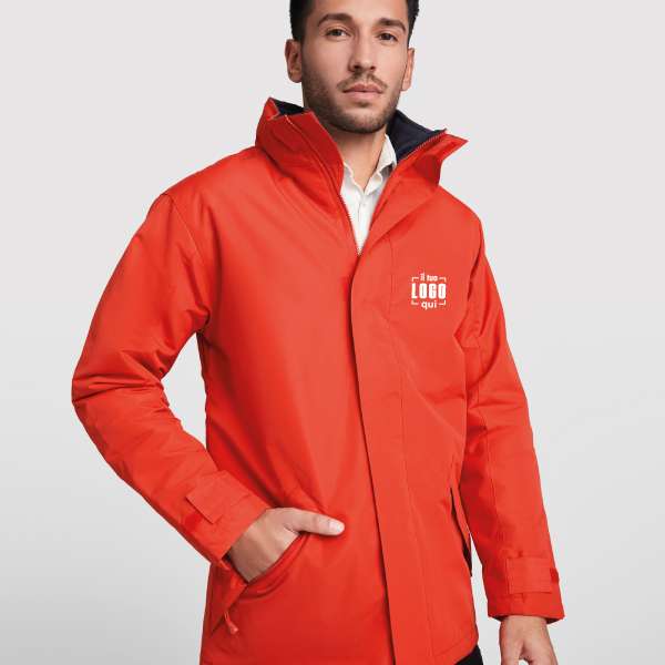 Giacca impermeabile imbottita. Cerniera centrale con doppio tiretto e pattina abbinata. Collo alto con cappuccio ripiegabile. Tasche laterali con cerniera e pattina. Polsini regolabili con cinturini. Due tasche interne con chiusura a strappo. Cerniera interno per l’accesso alla decorazione. Impermeabile. Anti-vento. Il modello è alto 184 cm ed indossa una taglia L.