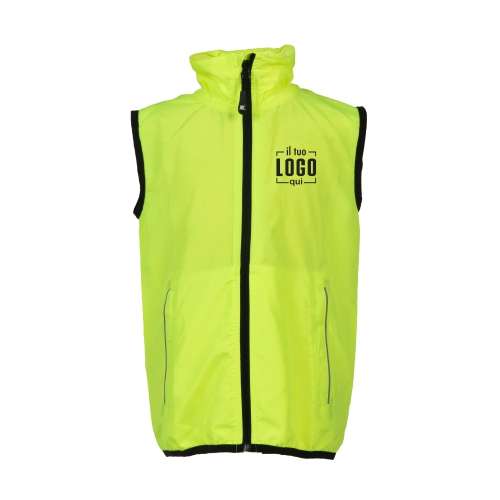 Gilet in poliestere ripstop,- Non imbottito- Senza fodera- Cerniere nastrate YKK- Cappuccio estraibile in Ripstop- Tessuto traspirante sul colletto- Nastro di rinforzo interno colloe tessuto appendiabito fluo- Due tasche con zip coperte e con profili rifrangenti- Tessuto traspirante coperto sulla schiena con profilo rifrangente- Tessuto elastico nel giromanica e al fondo