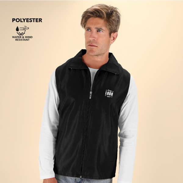 Gilet unisex in tessuto leggero e traspirante con fodera in rete bianca. Zip frontale coordinato e tirazip argentato, con una tasca esterna su ogni lato.