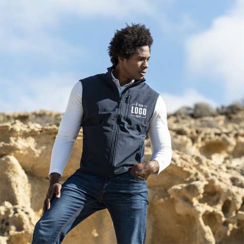 Gilet impermeabile e traspirante fabbricato con una combinazione di materiali RPET, realizzati con plastica riciclata, per promuovere il riutilizzo dei rifiuti plastici e contribuire alla sostenibilità del pianeta: esterno in soft shell 300g/m2 ed elastan interno in micropile 100% poliestere. Con etichetta ecologica sull'orlo inferiore dell'indumento. Resistente al vento e all'acqua con cerniera principale e tasche frontali sul petto e laterali con cerniera invisibile e tiretti in tinta. Disponibile in una vasta gamma di colori e taglie S, M, L, XL, XXL