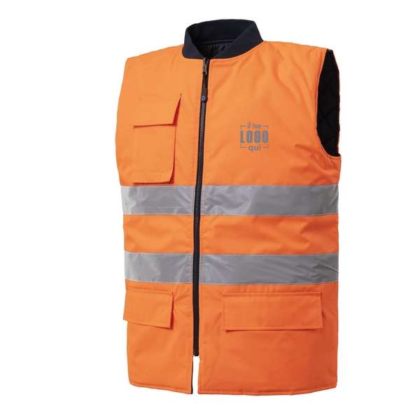 Gilet alta visibilità reversibile con 5 tasche, porta badge nella tasca superiore, chiusura centrale con zip YKK, tessuto interno imbottito quilty.