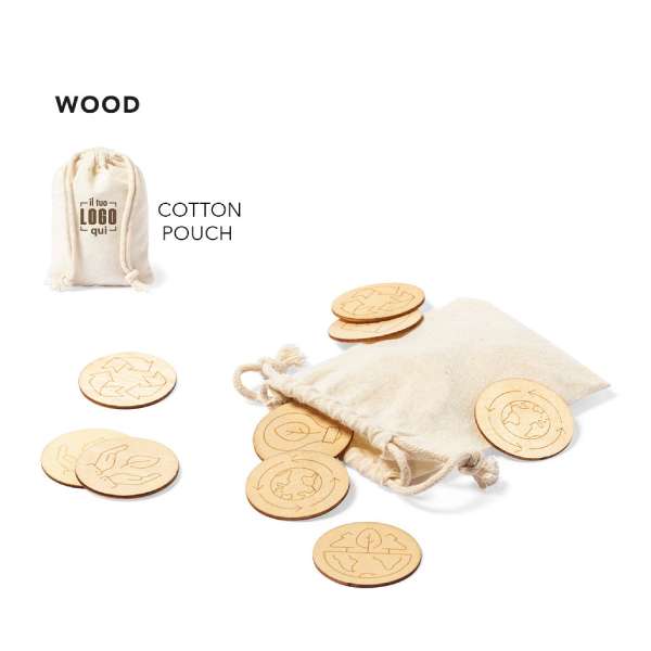Gioco di sensibilizzazione ecologica in legno. Set da 24 pezzi in una custodia in cotone 100% con coulisse abbinata.