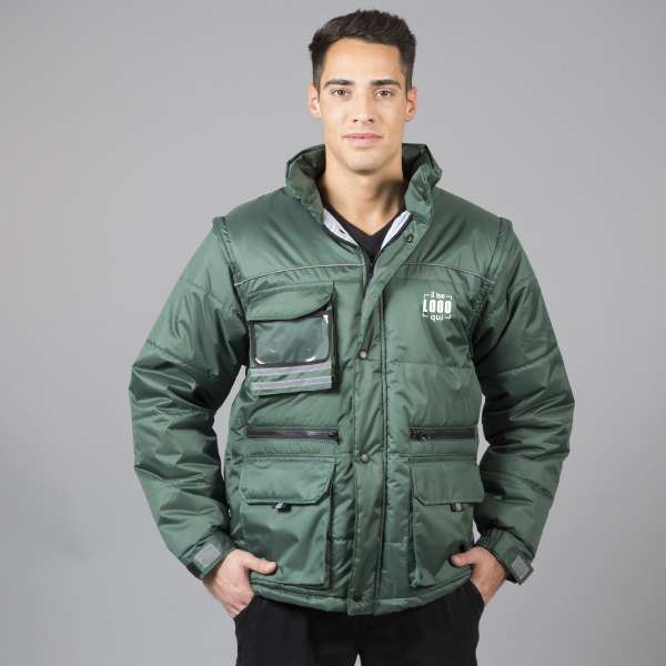 Giubbino in poliestere pongee- Spalmatura in PVC interna- Imbottitura in poliestere- Maniche staccabili- Fodera in poliestere- Cappuccio estraibile in poliesterepongee- Profili rifrangenti anteriori e posteriori- Tasca sul petto con portabadge ascomparsa- Due doppie tasche con patta echiusura con velcro- Due tasche con zip con foderarinforzata per utensili- Tasca interna portafoglio- Polsino con elastico regolabile con velcro- Coulisse al fondo- Bottoni automatici in metallo
