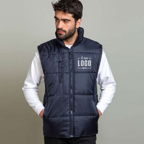 giubbino smanicato in poliestere; zip lunga con cursore removibile; tasca interna; tasca frontale verticale con badge a scomparsa; due tasche laterali