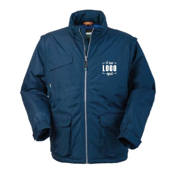 Giubbotto imbottito con chiusura anteriore con cerniera, cappuccio interno al collo chiuso con velcro e carré posteriore con inserti rifrangenti. Un taschino applicato al petto destro chiuso con aletta e velcro, un taschino interno al petto destro chiuso con velcro, due tasche inferiori applicate con soffietti laterali e scaldamani chiuse con aletta e velcro. Maniche staccabili, polsi al fondo manica con elastico e alamaro regolabile con velcro, cerniera orizzontale interna al fondo per possibilità di personalizzazione su schiena.