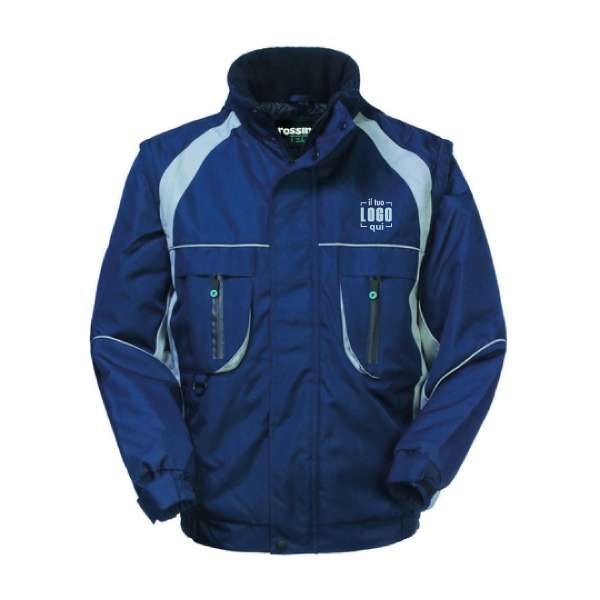 Giubbotto imbottito con cerniera coperta da patella chiusa con velcro e bottoni automatici, cappuccio con coulisse inserito nel collo in pile chiuso con velcro, maniche staccabili. Taschini con soffietto laterale applicati al petto chiusi con cerniera verticale e aletta, taschino interno al petto sinistro chiuso con velcro, tasche inferiori a filetto chiuse con patella antivento. Polsi al fondo manica con elastico regolabili con velcro, elastico e inserti di colore a contrasto lungo i fianchi, spalle anteriori e posteriori, maniche con profilo rifrangente grigio.
