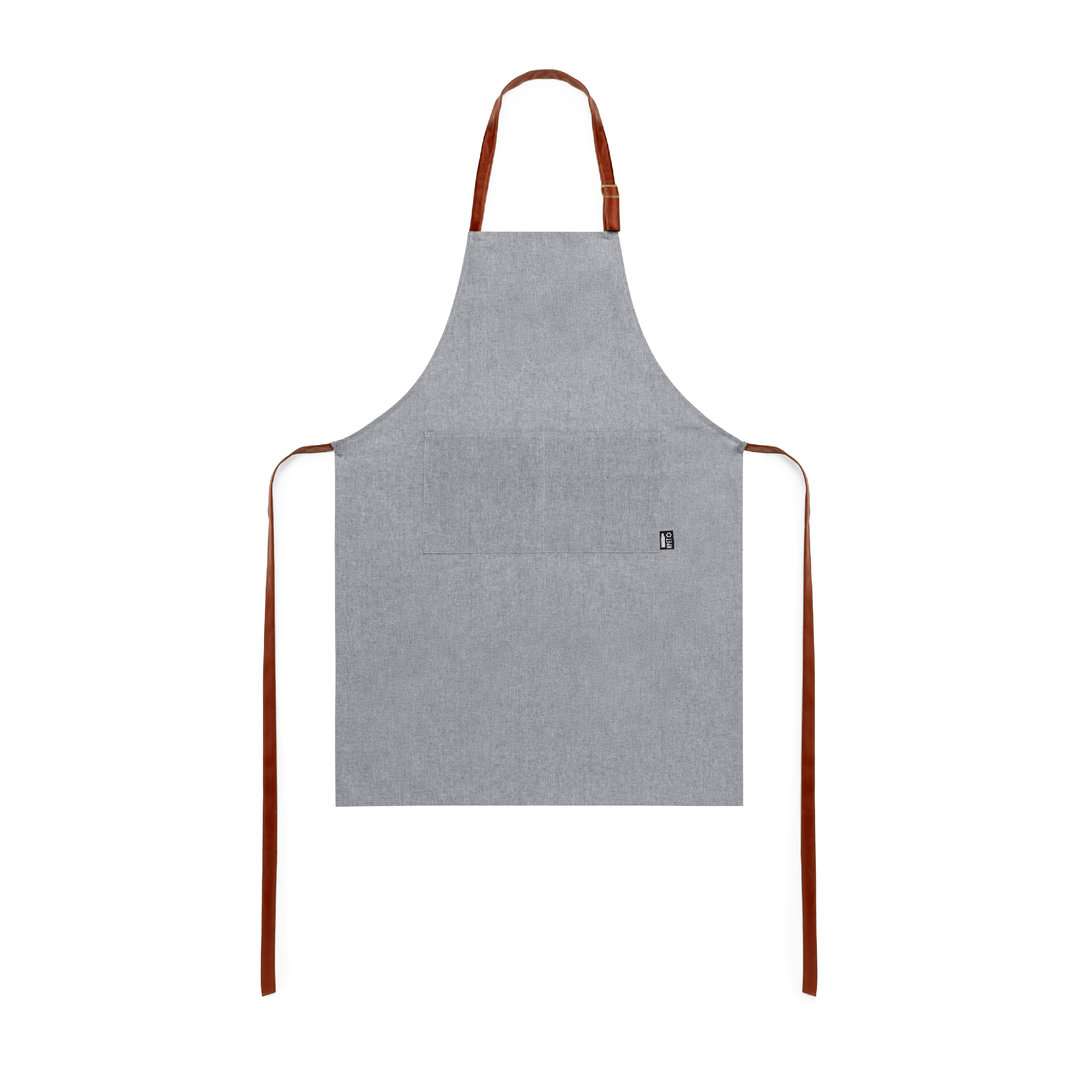 Grembiule della linea natura in materiale RPET, realizzato con plastica riciclata, per promuovere il riutilizzo dei rifiuti plastici e contribuire alla sostenibilità del pianeta. Tagliato sotto il ginocchio, con cinghie di regolazione in resistente similpelle e ampia tasca frontale. Etichetta RPET sulla tasca.