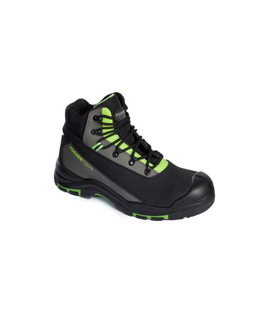 Calzatura alta con tomaia in tessuto nabuk con dettagli verdi in contrasto, linguetta imbottita in canvas mesh, puntale in fibra di vetro, lamina non metallica, fodera interna in tessuto traspirante. Soletta anatomica, traforata, con gel antishock sul tallone che assorbe gli urti, estraibile, traspirante ed antistatica. Suola antiscivolo in poliuretano bidensità.