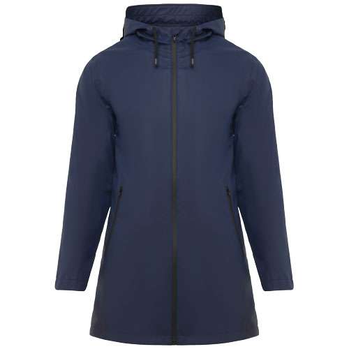 Giacca impermeabile da donna. Cappuccio con visiera. Cerniere e cuciture termosaldate. Dettagli a contrasto di colore nero. Due tasche laterali con cerniera. Fessure sul retro del cappuccio. Etichetta rimovibile. Impermeabile. La modella è alta 179 cm ed indossa una taglia S.