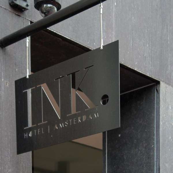 Insegna in dibond da 3 millimetri composito in alluminio, resistente e leggero con lettere intagliate e sospesa tramite ganci, un insegna elegante e resistente perfetta per hotel, negozi o altre attività commerciali.