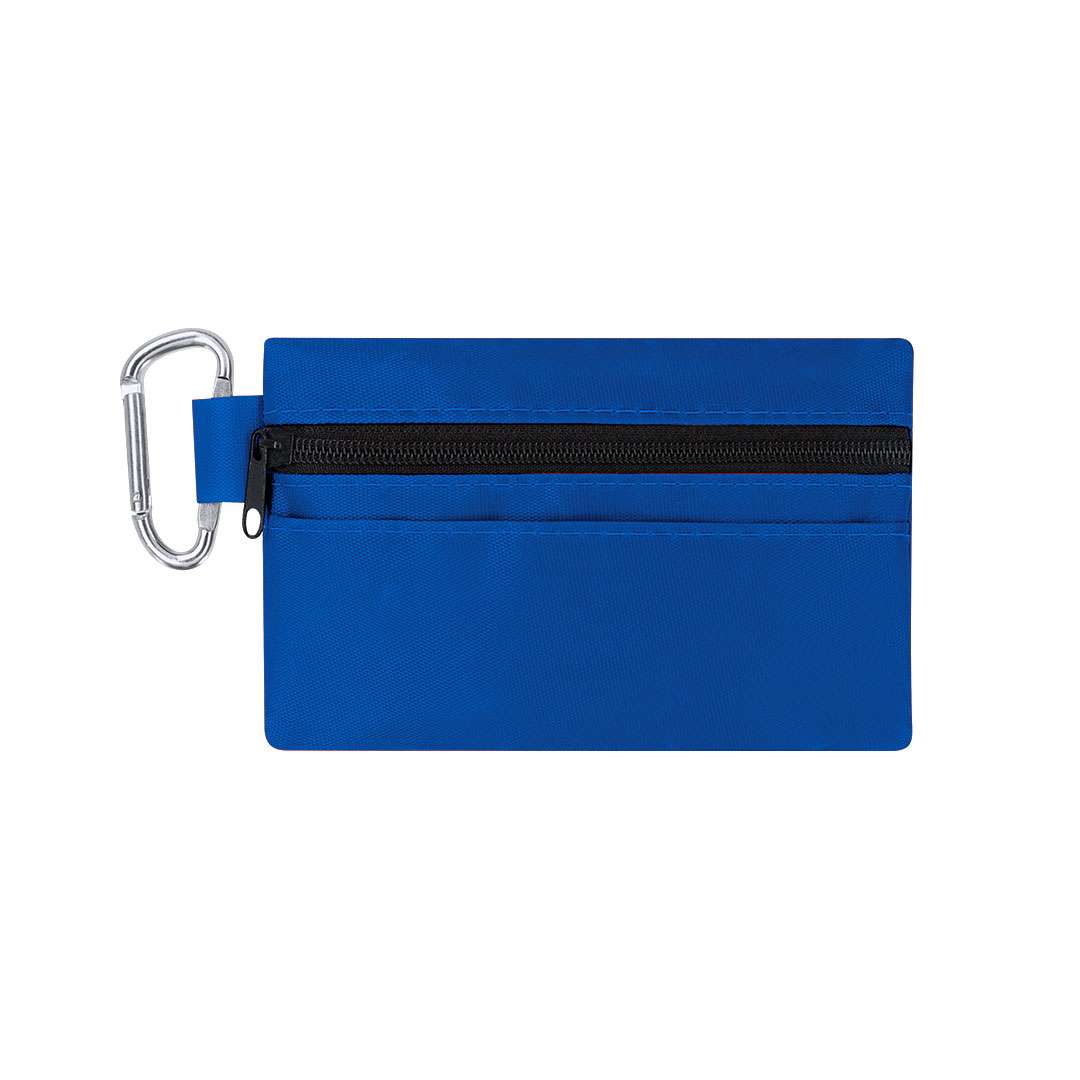 Kit di emergenza di 14 accessori in resistente astuccio in poliestere 600D, con chiusura a cerniera, tasca frontale e moschettone metallico. Include bende, salviette, asciugamani con alcool e salvietta per alleviare le punture.