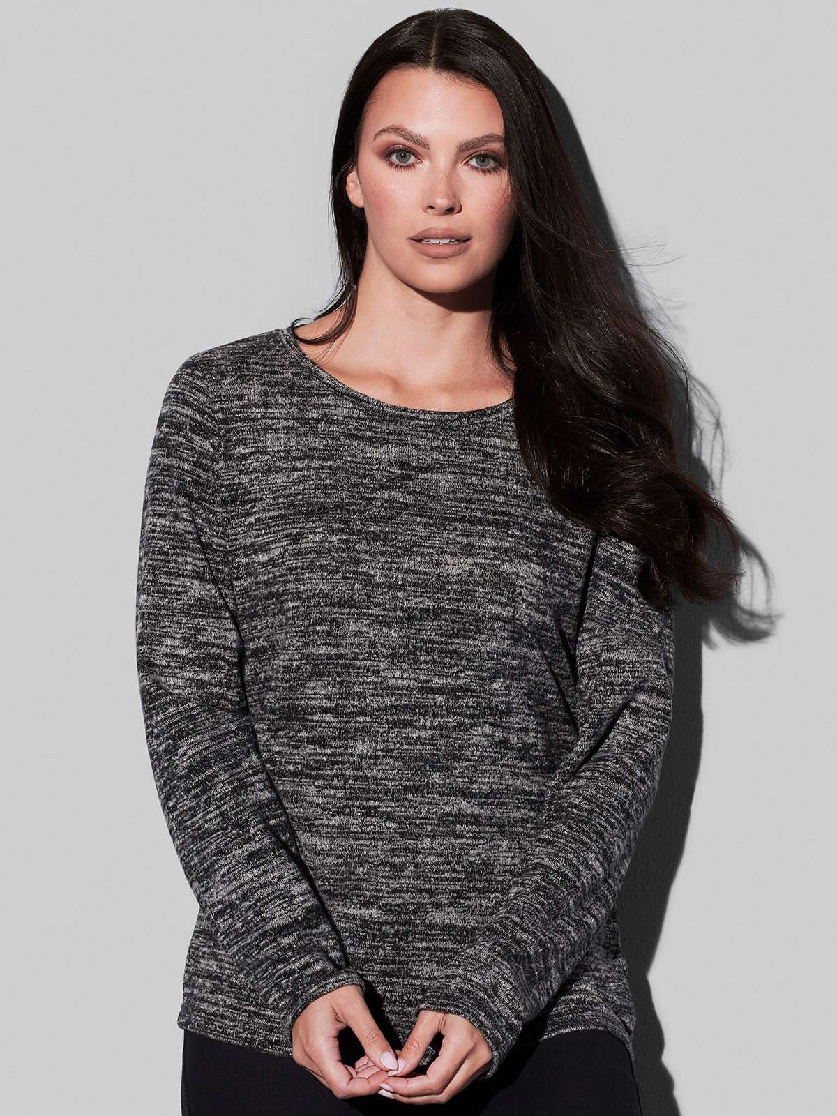 58% poliestere, 37% viscosa, 5% elastane. Pullover manica lunga da donna, cuciture laterali, disponibile in diversi colori melange.