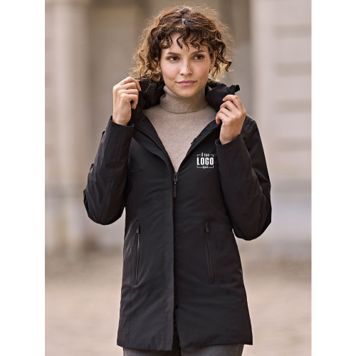 88% poliestere, 12% spandex. Parka da donna, doppio strato con rivestimento in poliestere 310T e imbottitura DuPont, cappuccio, una tasca interna , tasche frontali ampie e foderate, cuciture sigillate, zip bidirezionale e chiusura con bottoni magnetici, impermeabile 8000 mm., traspirante 3000 gr., antivento.
