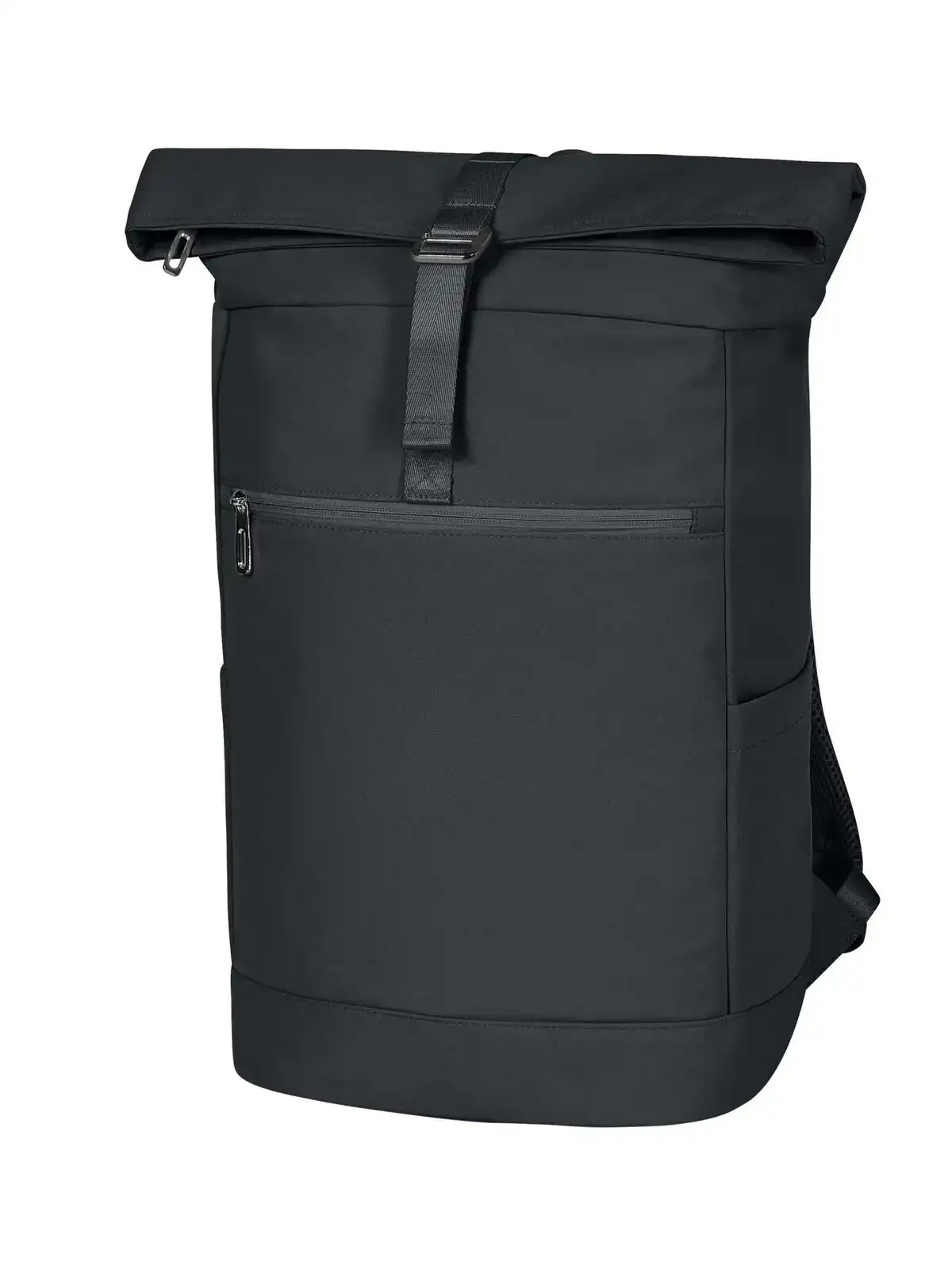 100% poliestere . Zaino roll-top con manico, scomparto principale con cerniera e sistema di chiusura regolabile con fascia ad anello. Accessori metallici di alta qualità. Scomparto imbottito per notebook. Tasca anteriore con zip, due tasche a inserto laterali, fondo imbottito. Dimensioni: 28x43x16cm. Capacità: 18litri. Area di stampa: 16x20cm.