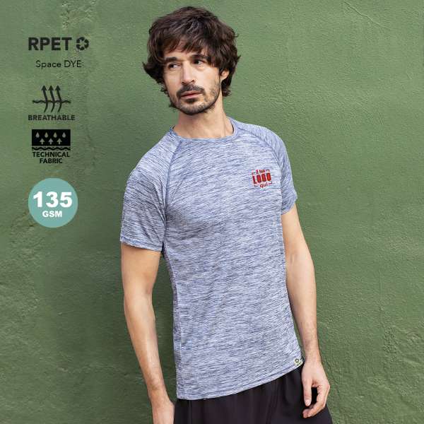 T-shirt tecnica unisex realizzata in materiale RPET traspirante da 135g/m² con una tinta Space Dye unica, che conferisce un effetto multicolore alla maglietta. Con maniche raglan, girocollo e etichetta con logo RPET per garantire la sostenibilità. Disponibile in un'ampia gamma di colori Space Dye, perfetta per attività sportive o casual.