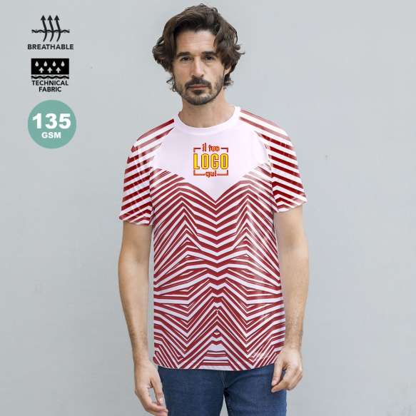 T-shirt tecnica in poliestere traspirante 135 g/m², con innovativo design a righe e zona liscia sul petto, perfetta per la personalizzazione con logo o stampa. Il tessuto è morbido al tatto, altamente traspirante e progettato per il massimo comfort. Dotata di maniche raglan per una maggiore libertà di movimento e girocollo rinforzato. Disponibile in una vasta gamma di colori vivaci per adattarsi a qualsiasi identità visiva o evento sportivo.