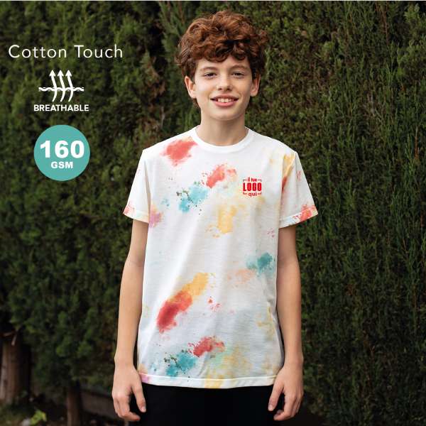 T-shirt bambino 100% poliestere da 160 g/m², traspirante e con trama effetto cotone. Design con stampe colorate e scollo rotondo comodo.