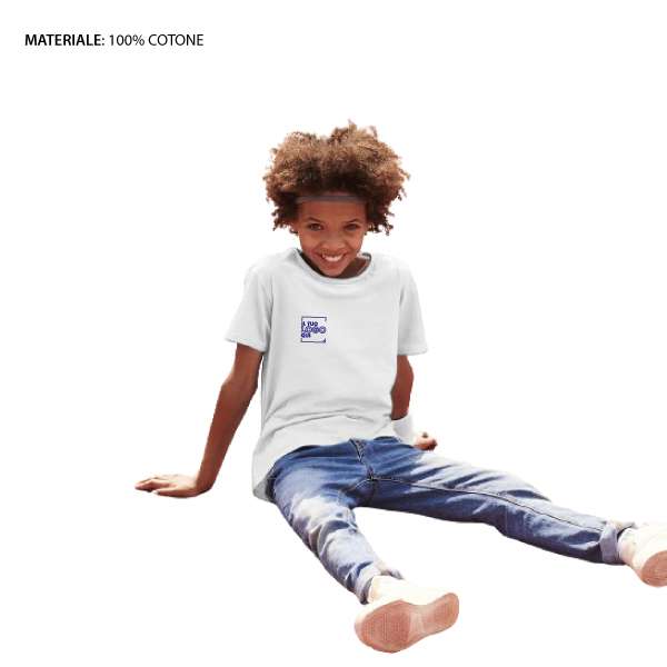 T-shirt bimbo Fruit of the Loom 100% cotone pettinato 140g/m². Morbida, taglio classico, girocollo a costine 1x1. Etichetta removibile. Taglie 3-15 anni.