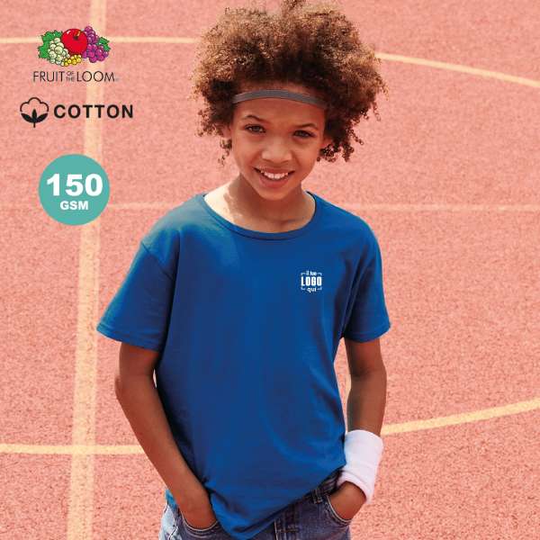 T-shirt Iconic bambino in cotone pettinato 150g/m² Fruit of the Loom. Taglio classico, morbida, girocollo a coste 1x1, etichetta removibile.