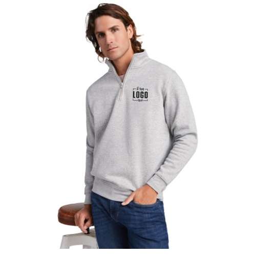Felpa con mezza cerniera in tinta e collo alto. Parte interna del colletto in colore coordinato. Copri cuciture rinforzate all'interno del colletto. Costine 1x1 sui polsini e sul giro vita. Il modello è alto 185 cm ed indossa una taglia M.