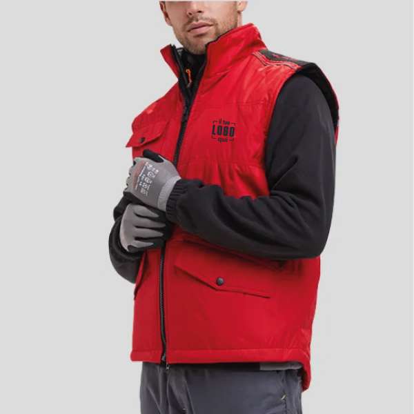 Gilet unisex, zip 8mm in plastica con cursore in metallo con patta e bottoni in plastica, retro sagomato, due tasche esterne LOCK SYSTEM e due con zip, inclinazione delle tasche per agevolare l'ingresso della mano, una tasca al petto porta smartphone e anella porta badge, bande riflettenti sulla tasca e schiena. Interno: imbottito, pile in contrasto su schiena e collo , una tasca, zip interna per agevolare stampe e ricami.