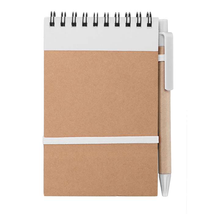 Pratico, compatto e sostenibile: questo notes ad anelli ecologico è dotato di una penna in cartone riciclato e di una resistente chiusura con elastico, per portarlo sempre con te in modo sicuro. Perfetto per l’uso quotidiano, riunioni, fiere o come gadget aziendale personalizzato.