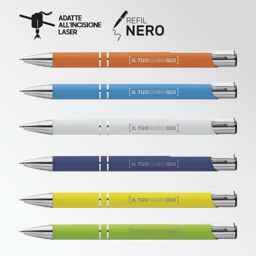 Penna a sfera elegante con corpo in metallo dalla raffinata finitura opaca. Dotata di meccanismo a scatto, minuterie in metallo cromato e refill nero per una scrittura fluida e professionale. Ideale come gadget aziendale, regalo promozionale o articolo da scrivania di classe. Personalizzabile tramite stampa UV o incisione laser.