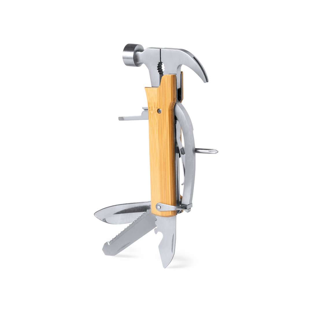 Multiutensile della linea natura con robusto corpo in acciaio inox e manico in bambù. Con 13 funzioni, tra cui martello ed estrattore di chiodi coltello e tagliaunghie cacciavite piatto e a croce lima apri lime e pinze. Cordoncino in similpelle abbinato e confezionato singolarmente in una scatola kraft.