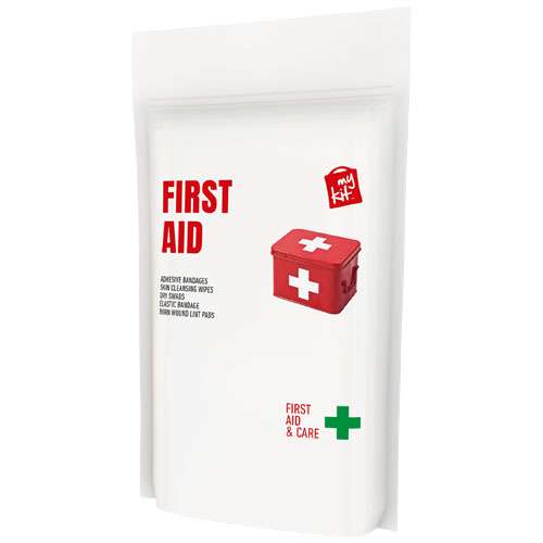 Questo kit di primo soccorso basico è utile a casa o in auto, pronto all'occorrenza per ogni evento. Contenuto: 12 cerotti resistenti all'acqua, 4 salviettine disinfettanti, 2 garze sterili, 1 benda elastica, 2 garze per ustioni. Tutti i prodotti contenuti nei MyKit rispettano le norme Europee vigenti. I prezzi includono stampa all-over fronte e retro. Fornito in una custodia di carta.