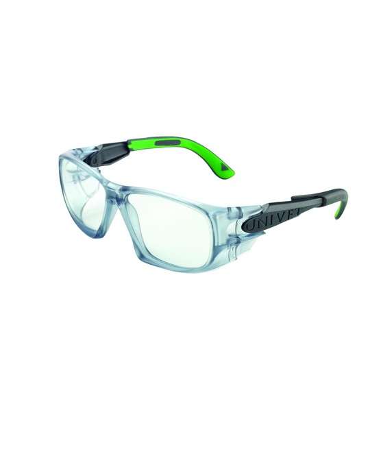 Lente chiara in policarbonato antigraffio e antiappannante, ripari laterali integrati, morbide astine con tecnologia brevettata softpad regolabili in lunghezza e inclinazione. Montatura in policarbonato ad alta resistenza, peso 35 g, classe ottica 1, classe d’impatto F.