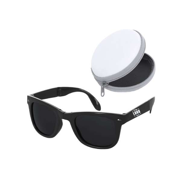 Occhiali da sole pieghevoli con protezione UV400, realizzati in PC Riciclato. Montatura pieghevole resistente con design elegante e finitura lucida di colore nero. Le lenti sono nere per garantire stile. Presentati in una custodia bianca a forma rotonda con chiusura a zip.
