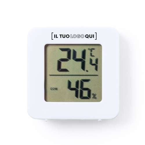 Orologio in ABS resistente con finitura bianca. Display LCD di facile lettura con termometro e misuratore di umidità. Fissaggio magnetico e alimentazione a batteria (batteria a bottone inclusa, con pellicola protettiva). Presentato in una scatola kraft individuale, con manuale di istruzioni in inglese e spagnolo.