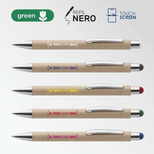 Unisci funzionalità e sostenibilità con questa penna a sfera con gommino per touch screen, perfetta per scrivere e navigare su dispositivi digitali. Il corpo in carta riciclata la rende una scelta green, mentre le minuterie in metallo cromato aggiungono un tocco moderno. Dotata di meccanismo a scatto e inchiostro nero.