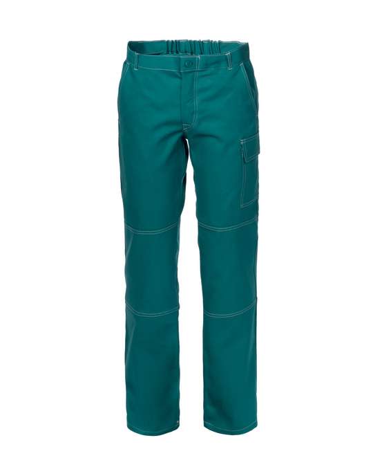 Pantalone da lavoro in cotone twill elasticizzato, con passanti in vita ed elastico posteriore, chiusura alla patta con cerniera e bottone scoperto, due tasche anteriori, una tasca posteriore applicata a destra chiusa con bottone, un porta metro applicato su gamba destra, un portapenne e un tascone laterale chiuso con aletta e velcro applicati sulla gamba sinistra, cuciture di colore a contrasto. ***4XL e 5XL solo per 01 blu e 12 grigio***