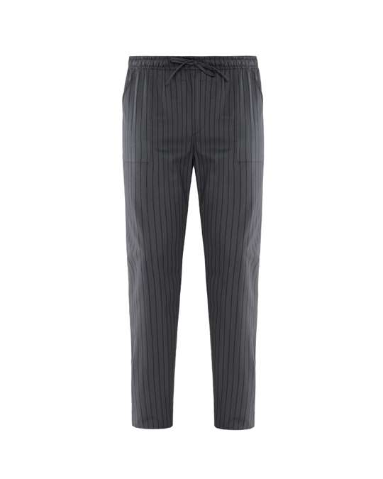 19P08P20 Pantalone dalla vestibilità regular e taglio trendy, realizzato in elegante tessuto gessato 70% cotone e 30% poliestere dalla mano morbida e resistente al candeggio. Proposto in due varianti: fondo nero con riga grigia e fondo grigio con riga nera. Fascione con coulisse, due tasche sui fianchi e piccola tasca posteriore.