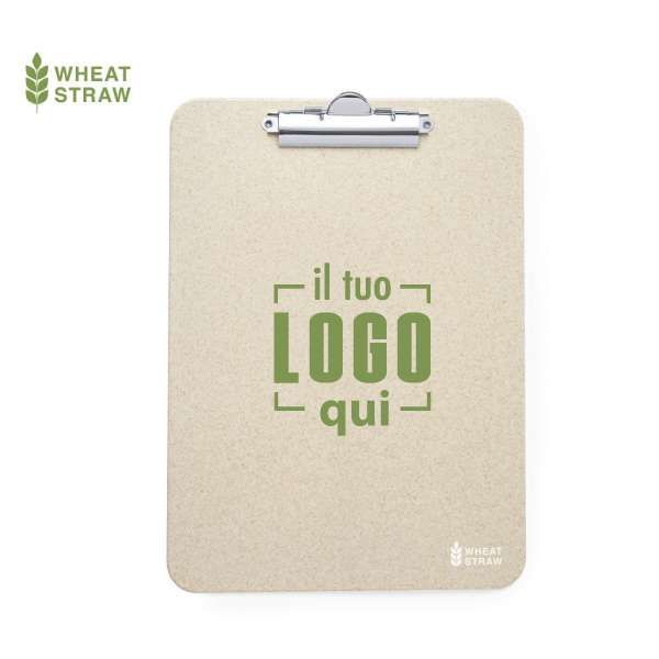 Porta blocco in fibra di grano. Robusto e resistente, con morsetto in metallo. Etichetta fibra di grano in un angolo e adatta a fogli fino al formato A4.